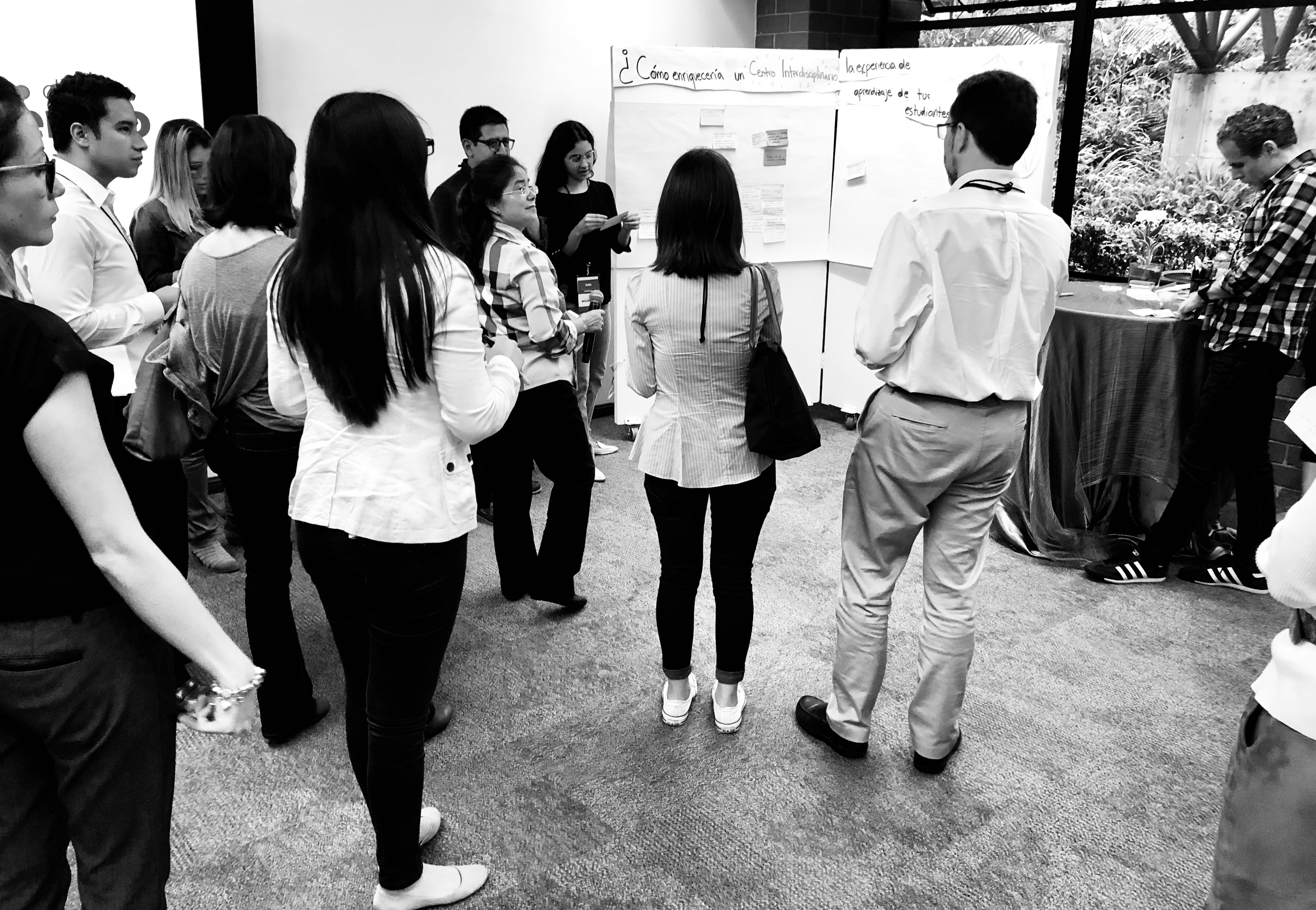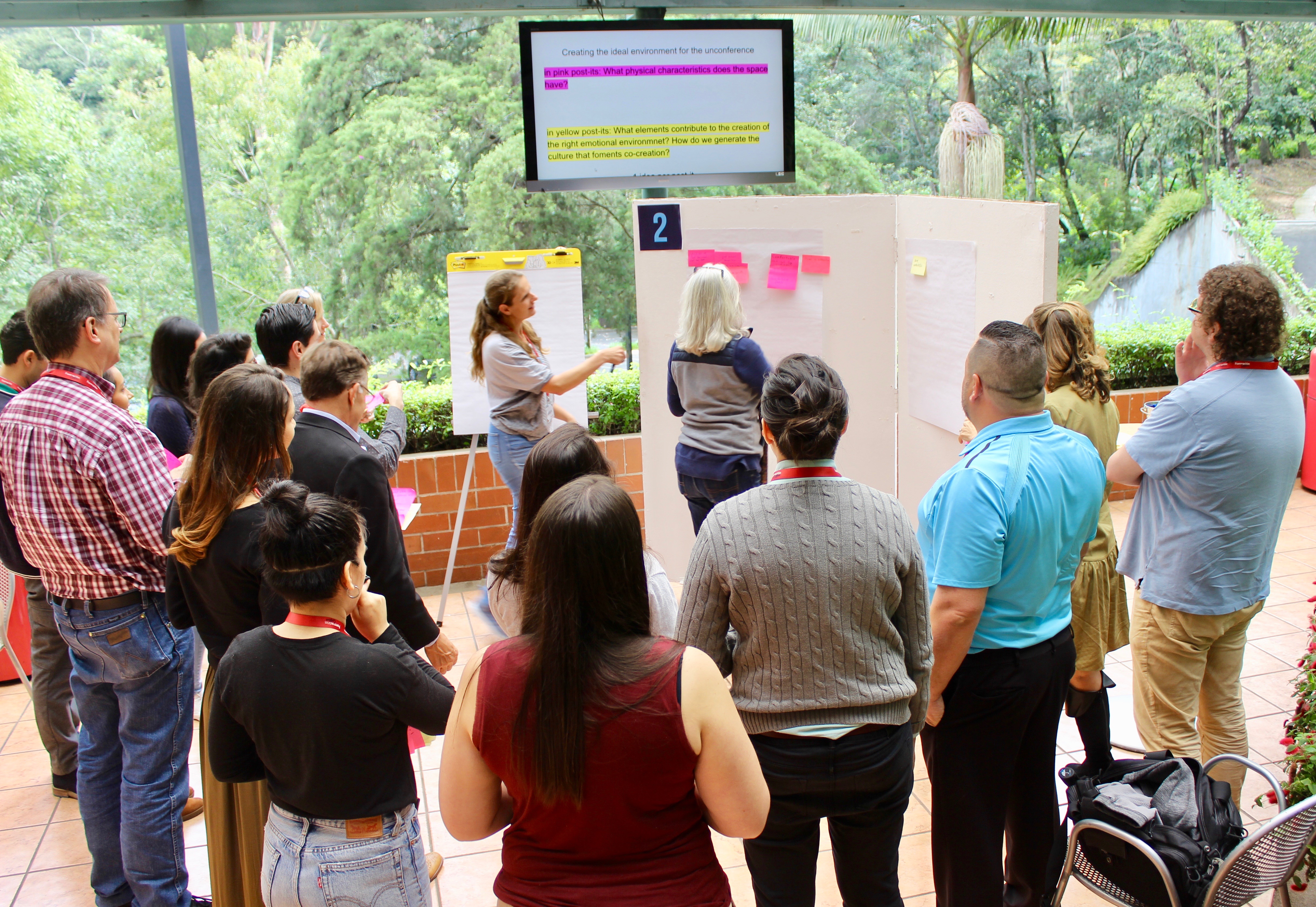 Poco a poco muévete hacia la parte detrás del grupo y permite que los participantes se adueñen del proceso. Los participantes no deben de presentar sus Post-its a ti sino a todos sus compañeros.