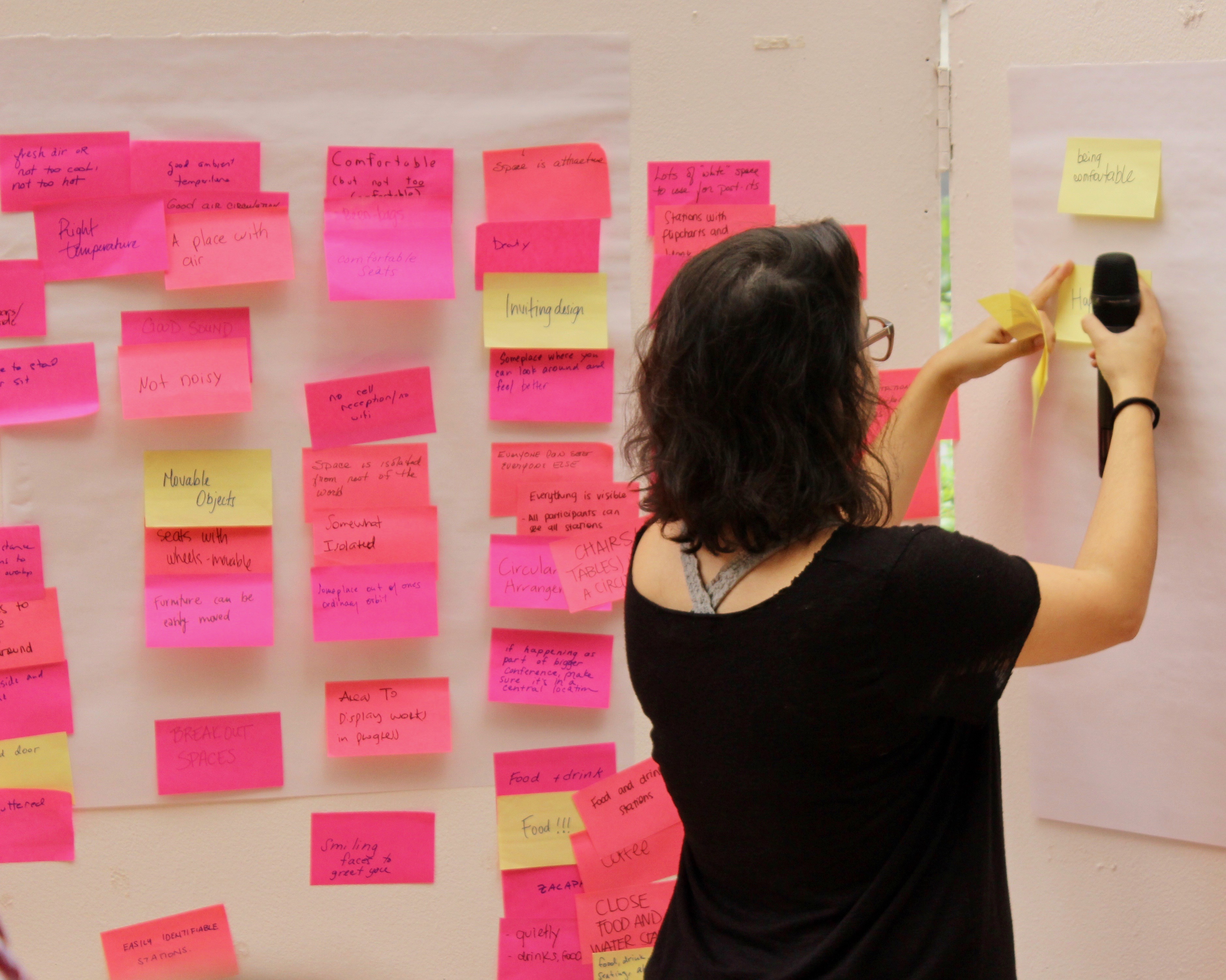 De esta forma todos los Post-its se pegan en el pizarrón. Las categorías no tienen que ser perfectas. Más adelante se podrán hacer modificaciones. La idea principal de esta fase es “sacar” todas las ideas de los participantes con eficiencia y sin anhelar la perfección.